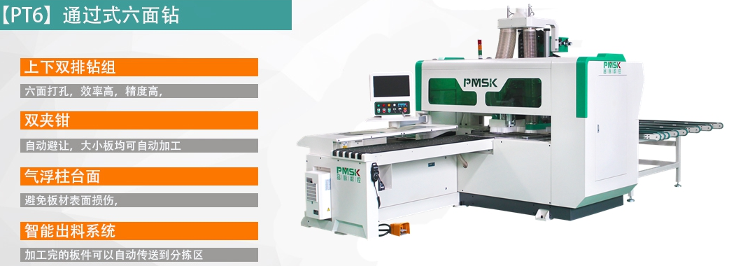 PT6通過式六面鉆是品脈數(shù)控自主研發(fā)設(shè)計(jì)的一款高端板式家具數(shù)控排孔設(shè)備,通過無線掃碼(帶排序功能),自動定位,雙夾鉗自動夾板,自動載入加工,一次實(shí)現(xiàn)六面孔位加工和正反面槽加工,加工完成后夾鉗自動將板件載入分揀回轉(zhuǎn)平臺,加工效率高,自動化程度高,是目前高端板式家具生產(chǎn)連線主要的排孔設(shè)備。